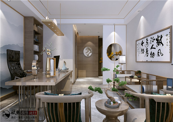 现代中式风格办公室装修装饰是从中式风格发展而来的,在本案办公室装修设计中一定程度上还遗留着中式风格的雅致气息,是一种怀古融今、开创未来的新风尚、新潮流,这也是时代发展现代气息浓郁中,中式风格办公室装修装饰等工装必然发生的转折点。在中式传统文化的渲染之下,给予办公环境以浓厚的艺术气息,增强空间的格调,富有空灵、禅意之美。同时将企业文化理念融入其中,并且能够在设计细节中体现企业创始人的品味喜好,从整体感官上体验企业创始人的审美情趣。在中式元素的装饰点缀之下,不仅给员工工作营造良好氛围,还能将客户与来宾中对企业的理解和感悟进一步加深。